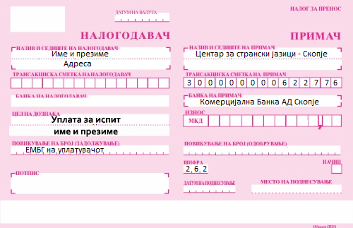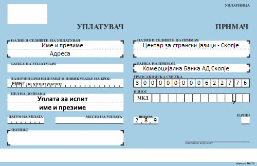 Пополнете ја пријавата и уплатете ја сумата за тестот според дадените примероци подолу. Цената и датумот за тестирање се наведени во формуларот за пријава за тестирање кој се наоѓа подолу. Штом ја утврдиме уплатата ќе Ви испратиме потврда на Вашата е-пошта која сте ја навеле во пријавата.