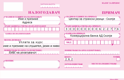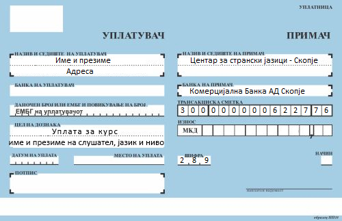 Пополнете ја пријавата со кликнување на копчето „Пријави се за тестирање“. Уплатете ја сумата за тестот според дадените примероци подолу. Цената за тестирањето чини 700 денари. Штом ја утврдиме уплатата ќе Ви испратиме посебна лична лозинка заедно со линкот од онлајн-тестот на Вашата е-пошта која сте ја навеле во пријавата. Вашата лична лозинка можете да ја користите само еднаш. Резултатите автоматски се испраќаат до нас за проценка и во најскоро време ќе контактираме со Вас и ќе Ви закажеме термин за усниот дел од тестирањето. Усното тестирање се врши преку платформата на ZOOM. По завршување на тестирањето, резултатите ќе Ви бидат пратени по електронски пат (е-пошта).